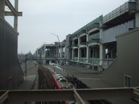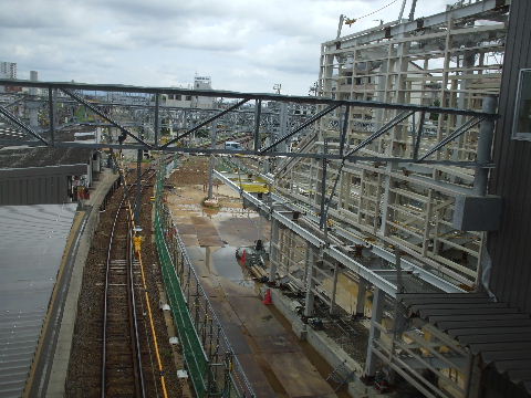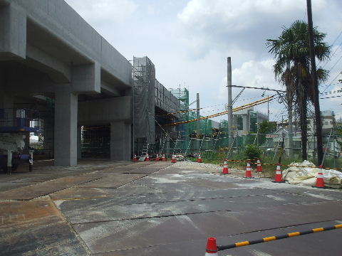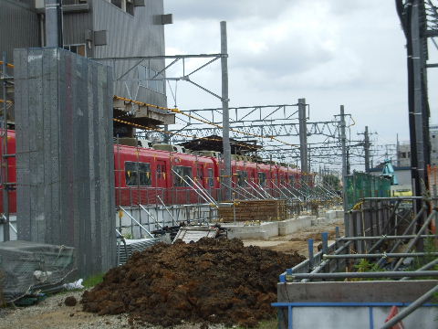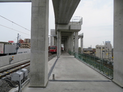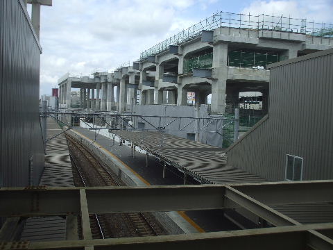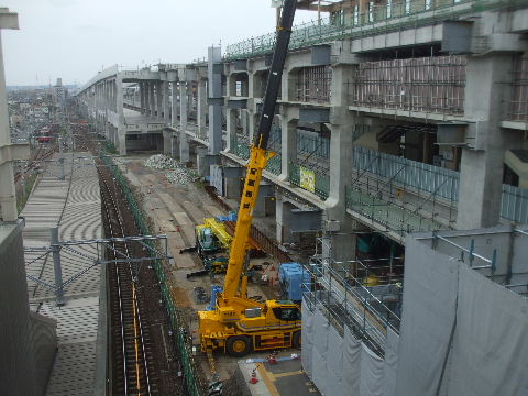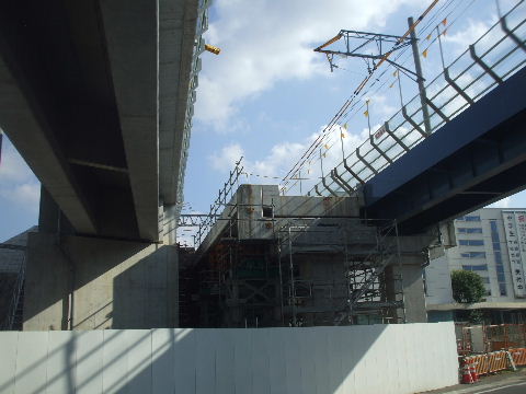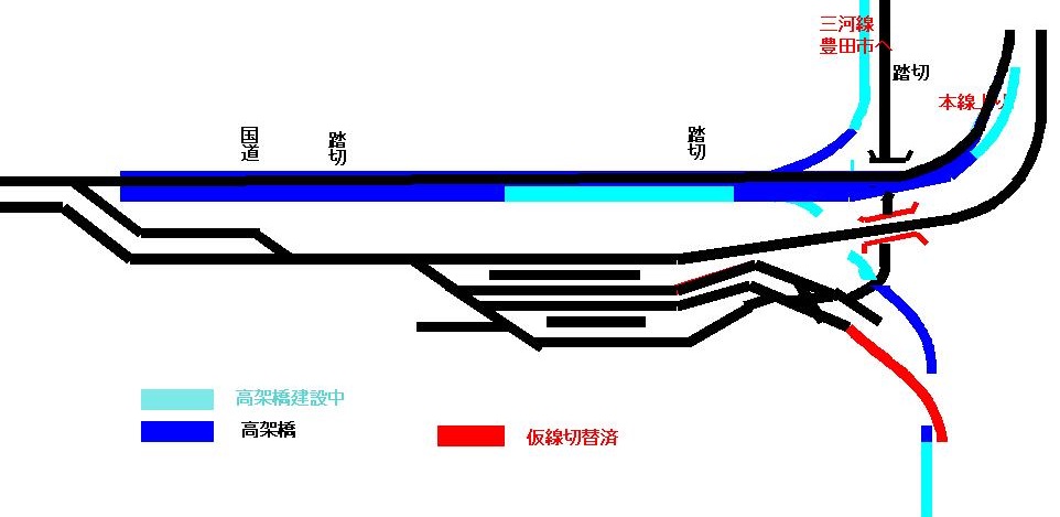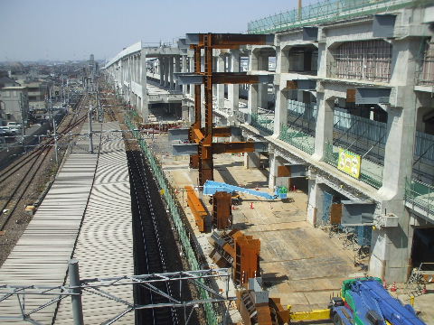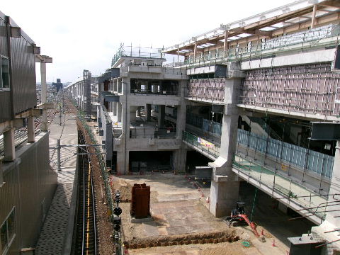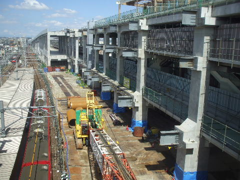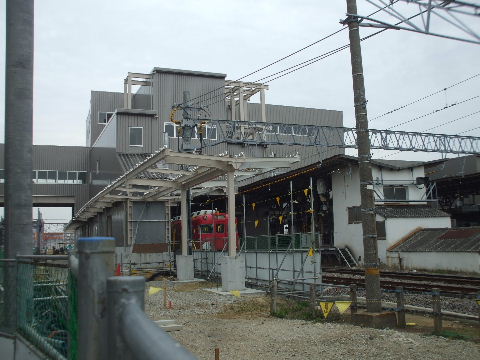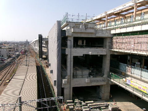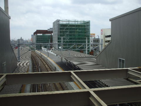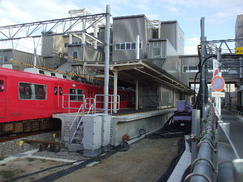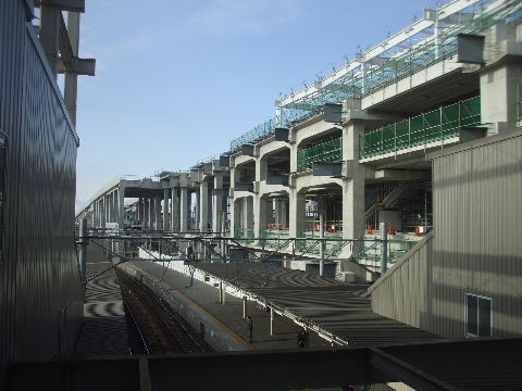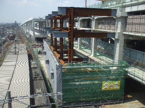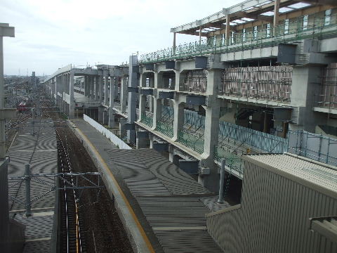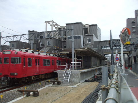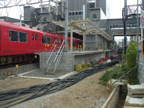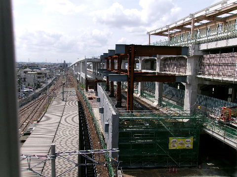 | 2011年7月11日。出来上がっている。三河線上が3階構造になっていたりあちらこちらに鉄骨が飛び出たりしていたりで将来、仮ホームが出来たり部分的に高架化された時にそこへつなぎ直しやすいように作ってあるように見える。 |