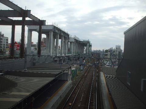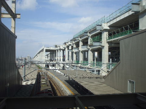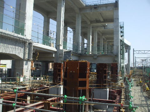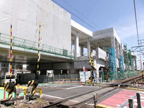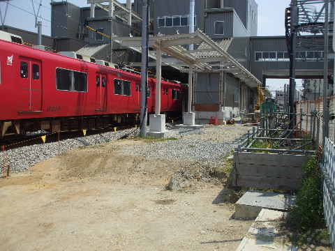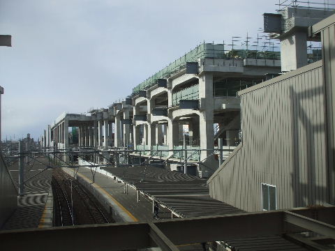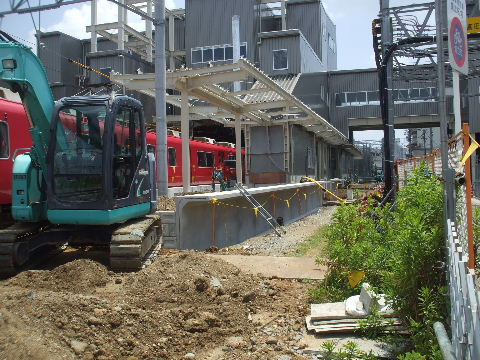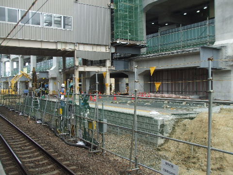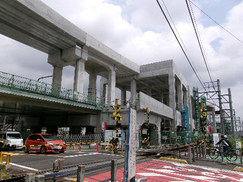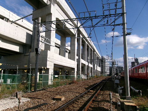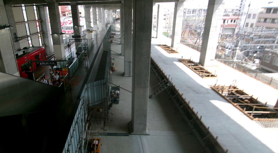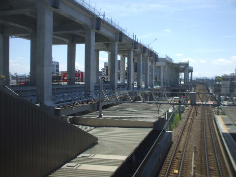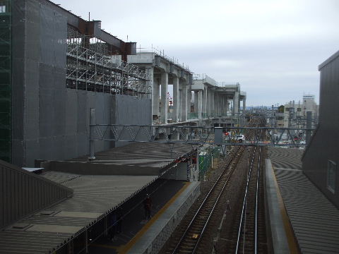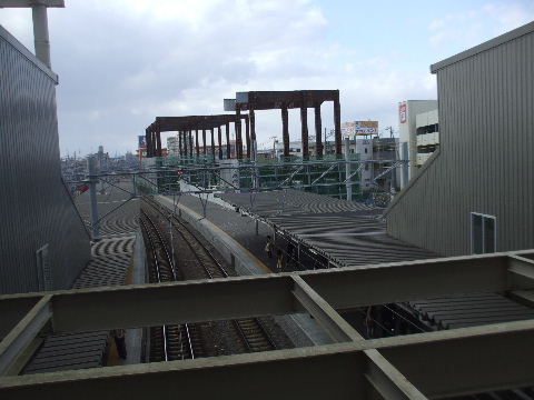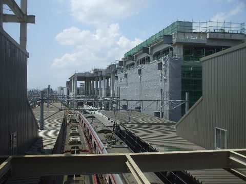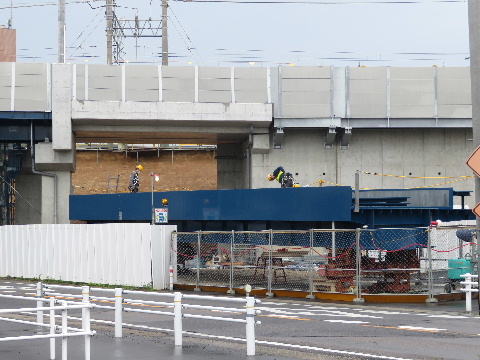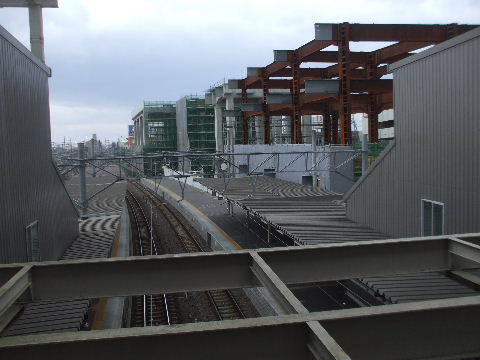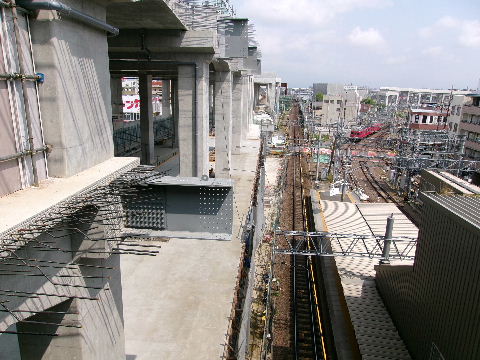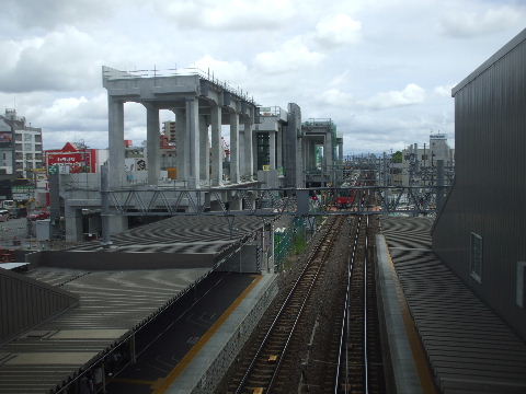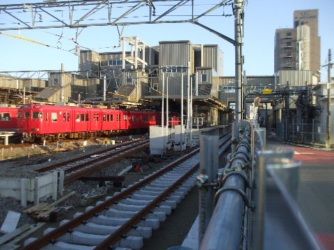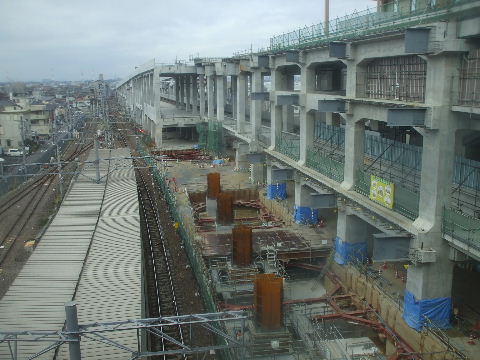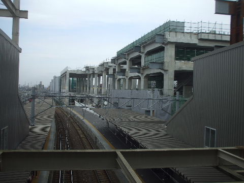 | 2011年7月11日。出来上がっている。三河線上が3階構造になっていたりあちらこちらに鉄骨が飛び出たりしていたりで将来、仮ホームが出来たり部分的に高架化された時にそこへつなぎ直しやすいように作ってあるように見える。 |