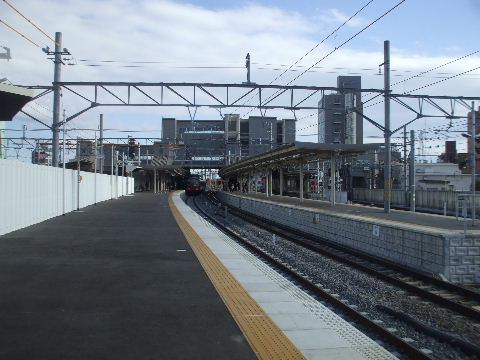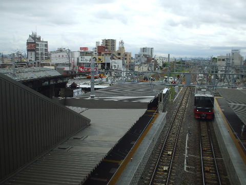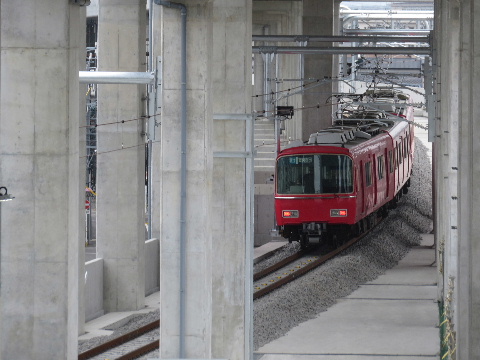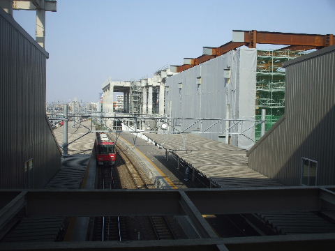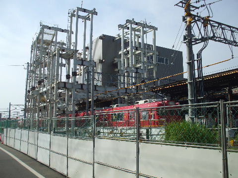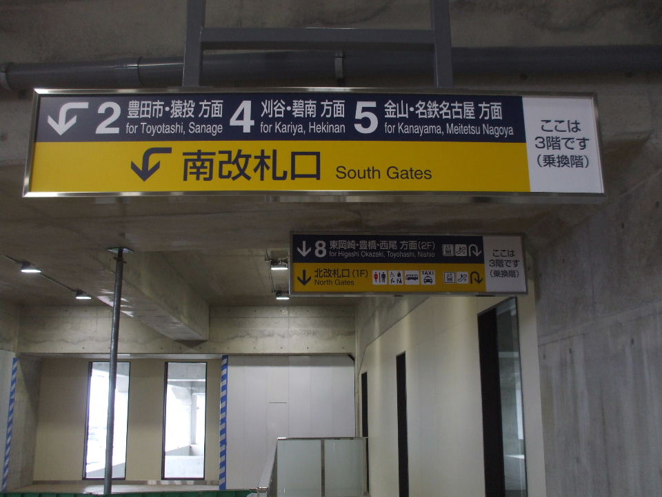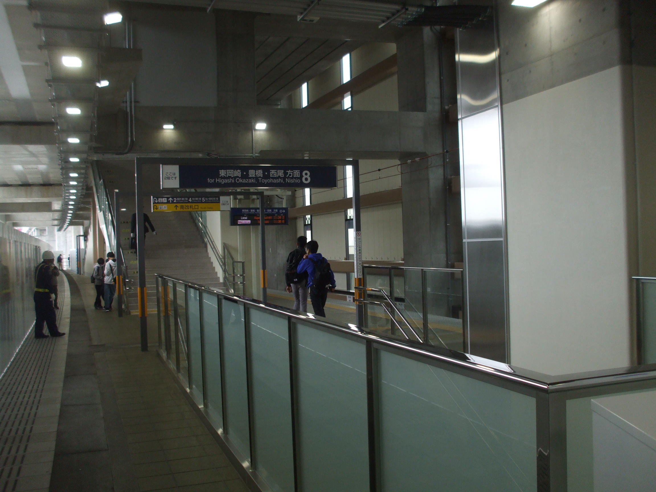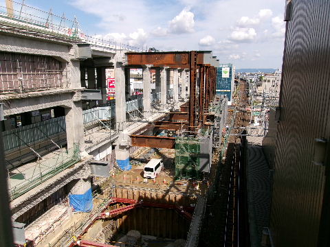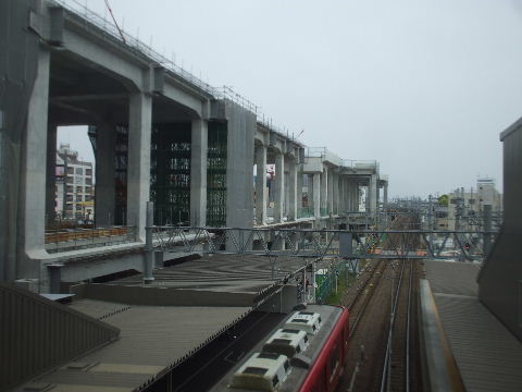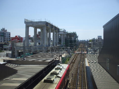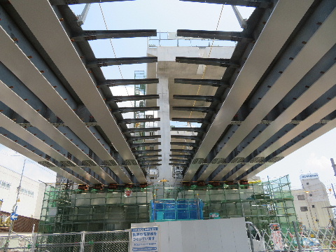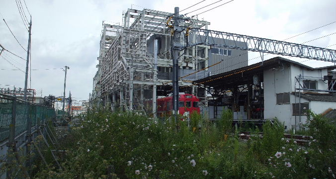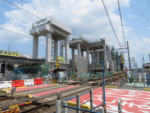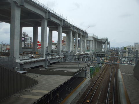 | 2011年7月11日。出来上がっている。三河線上が3階構造になっていたりあちらこちらに鉄骨が飛び出たりしていたりで将来、仮ホームが出来たり部分的に高架化された時にそこへつなぎ直しやすいように作ってあるように見える。 |