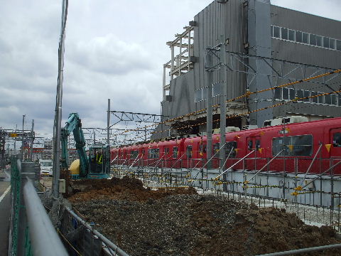 2024年12月15日。同じ高さのビルが出来てきた。 前の道路では今までの道路右横に確保したところ でも道路づくり中。4車線道路になりこれが高架 駅下を通り抜けることになる。 |