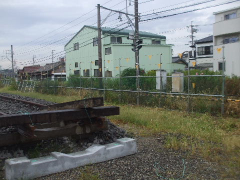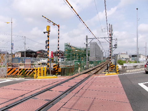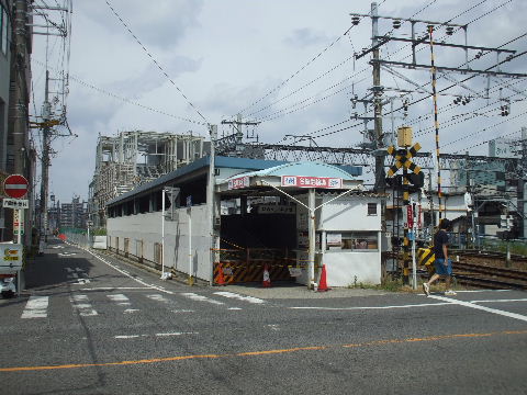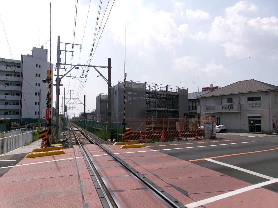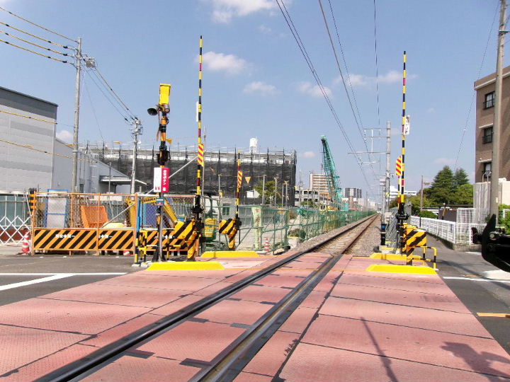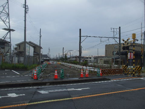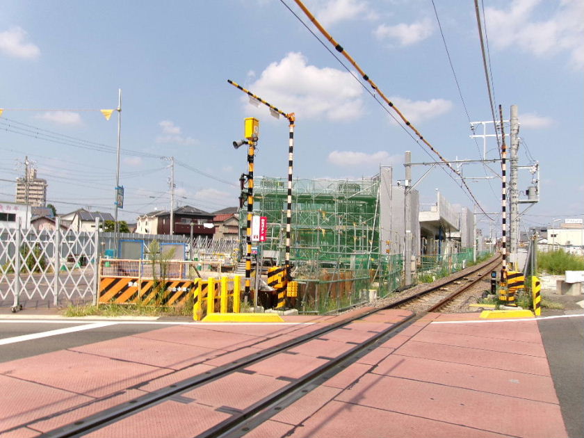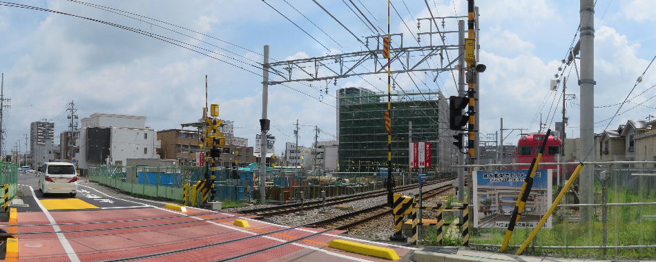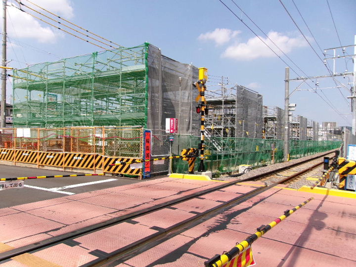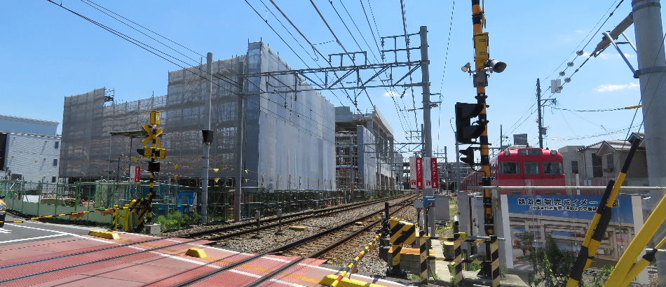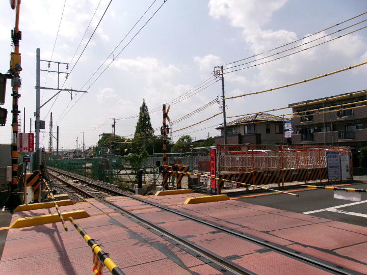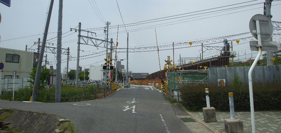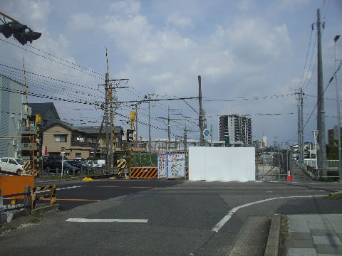 2020年06月21日。高架から地平に下りてきた所の踏切脇に工事事 務所が設置されている。 |
