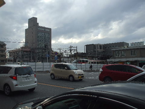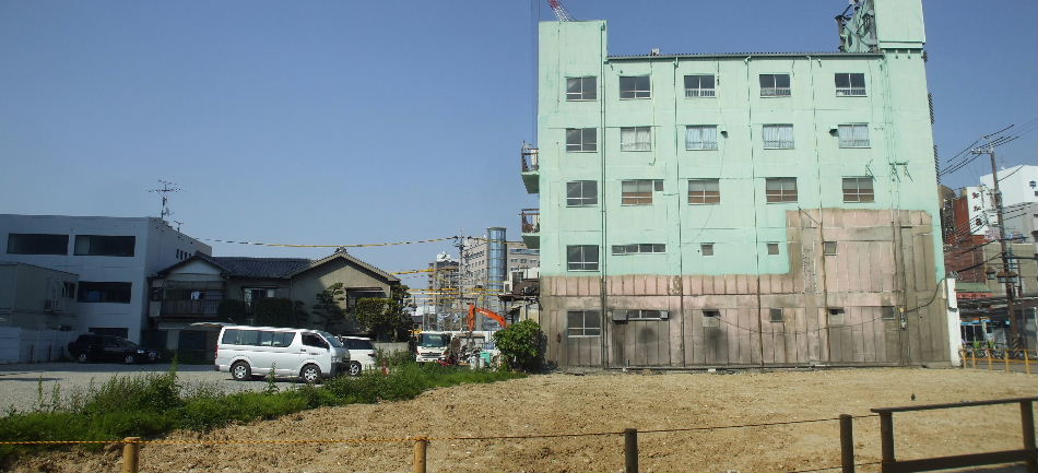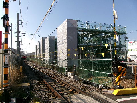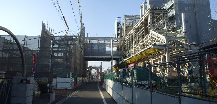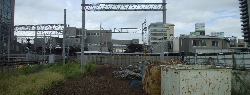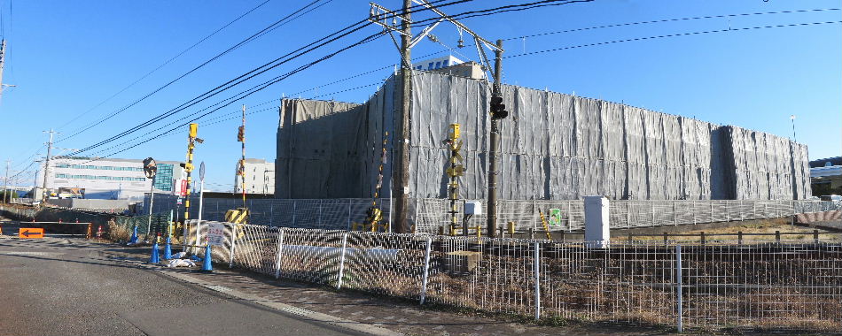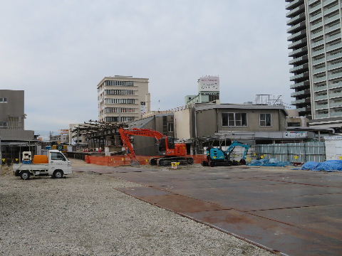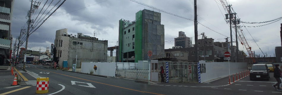 | 2020年12月13日。東から見る。左で解体中。右は線路沿いの居 酒屋ビルの手前に黒いビルができた。 |