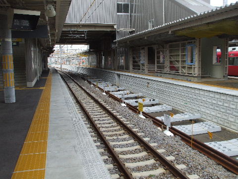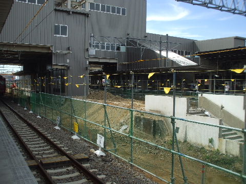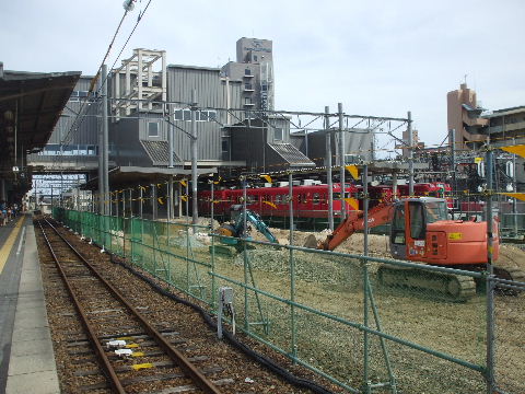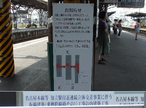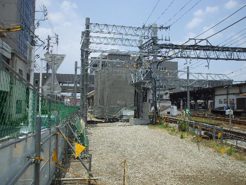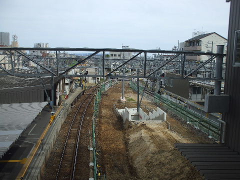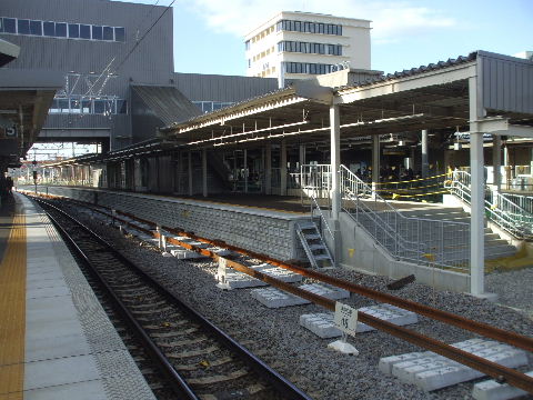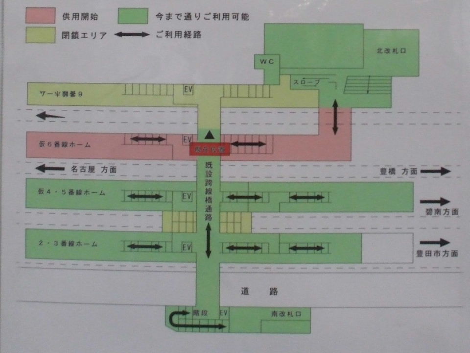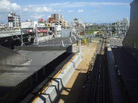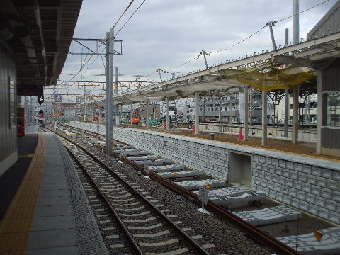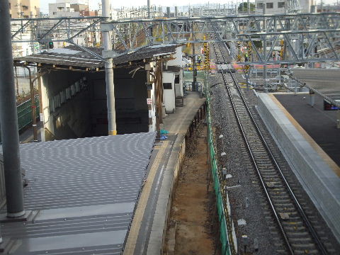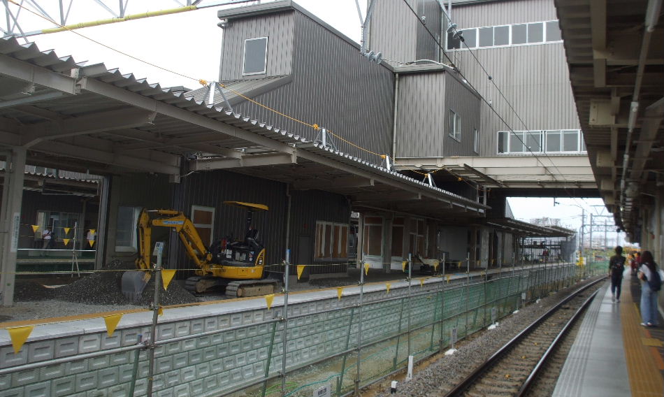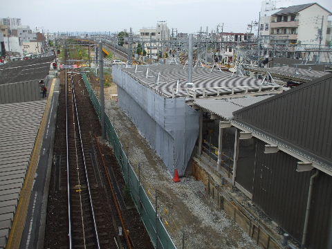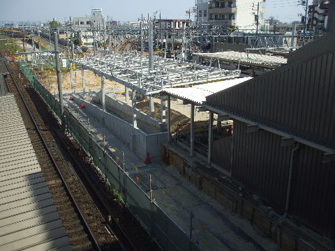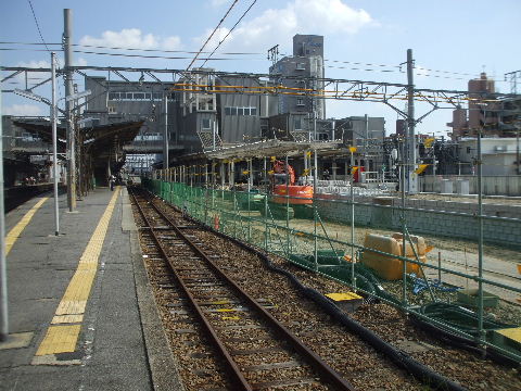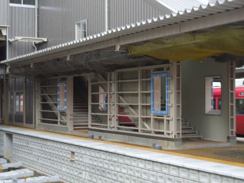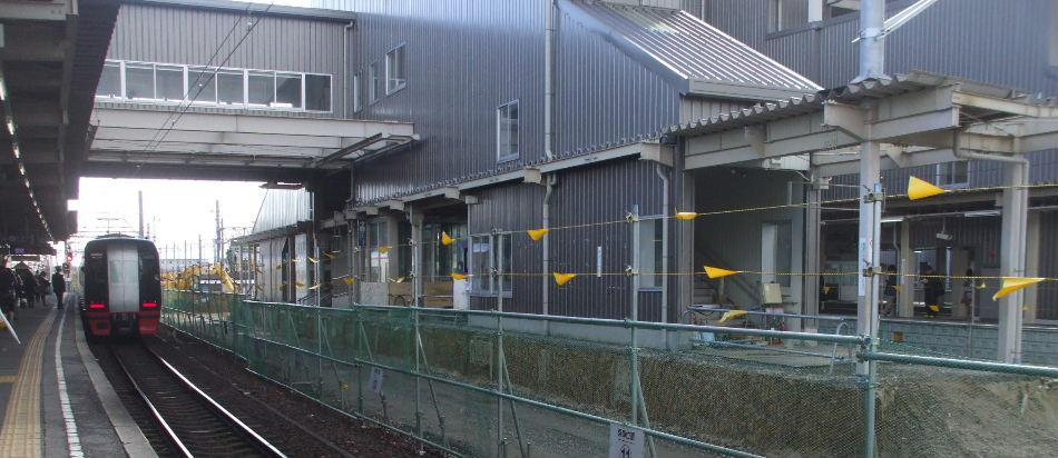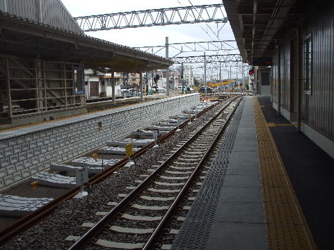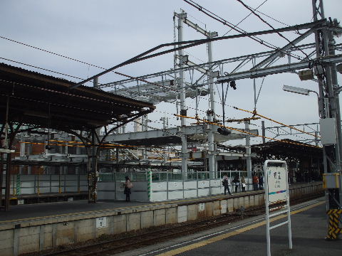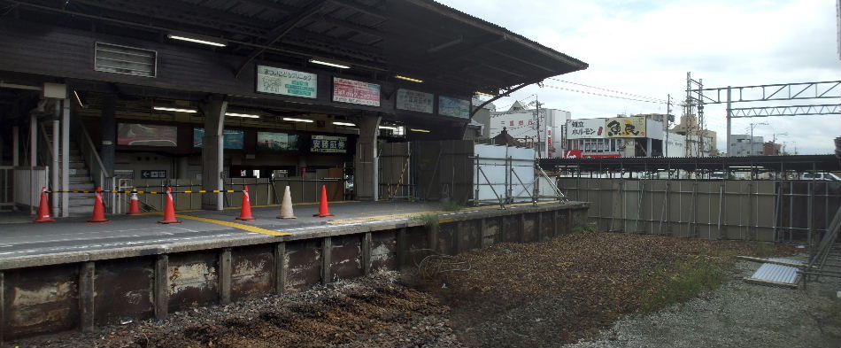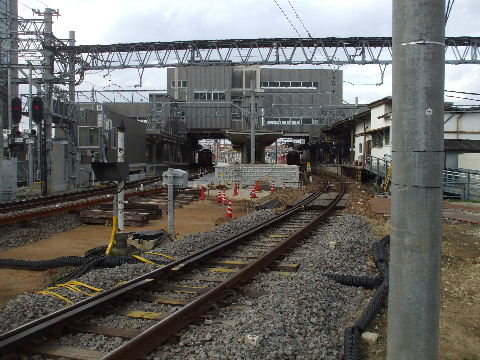 | 2010年5月1日。下り(名古屋方面)ホームの真ん中に3本、屋根を突き抜けてコンクリート柱が立てられている。仮駅建設に関係あり?。上下ホームのうどん店は2009年末に閉店している。 | 2010年7月10日。本線ホームの中程、屋根が撤去されている。エレベーター用の跨線橋が建設される。 |