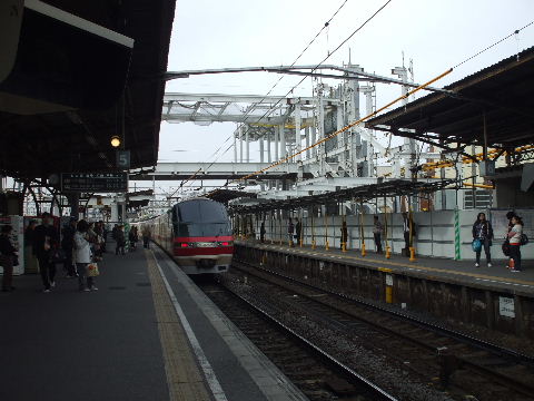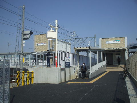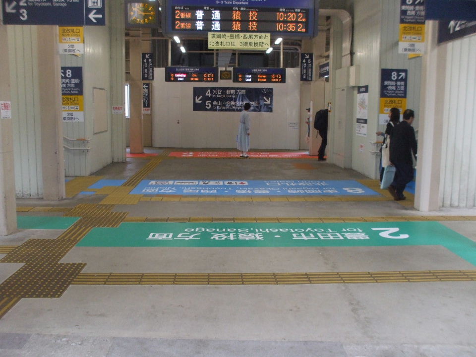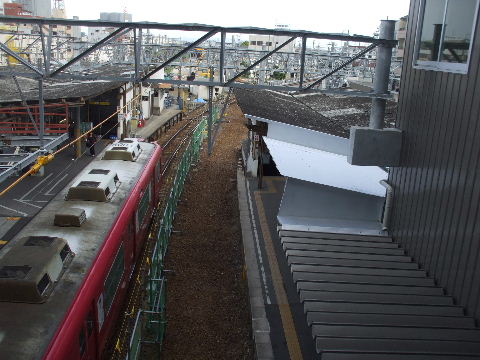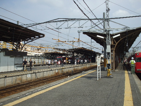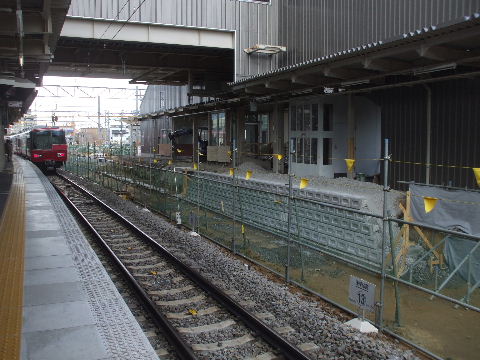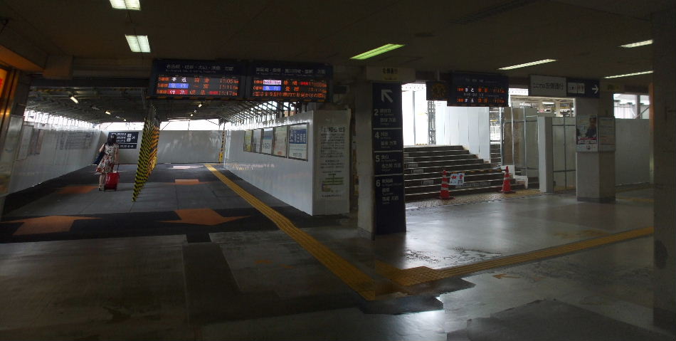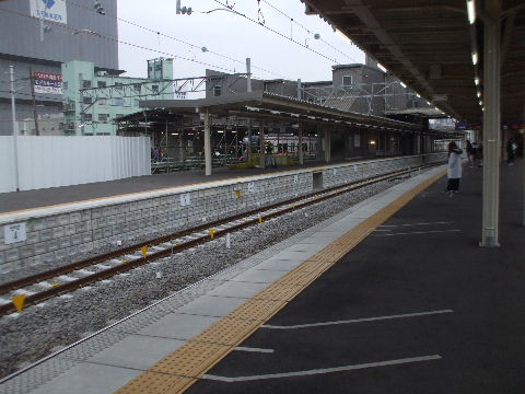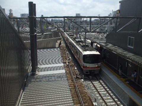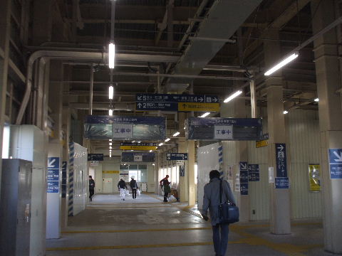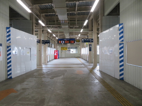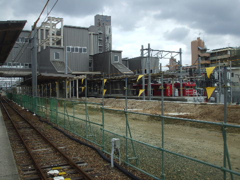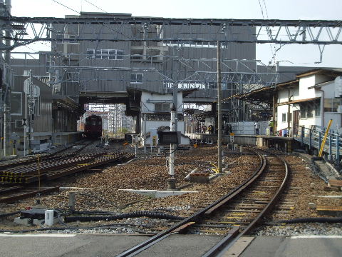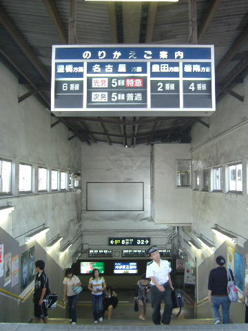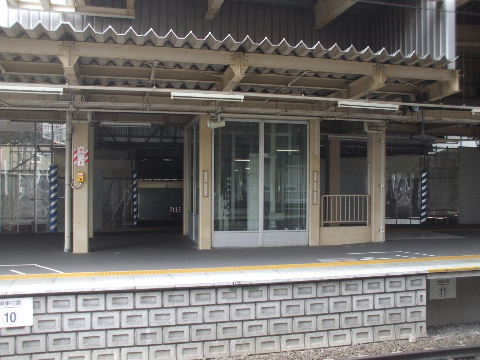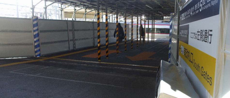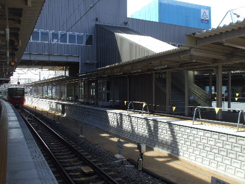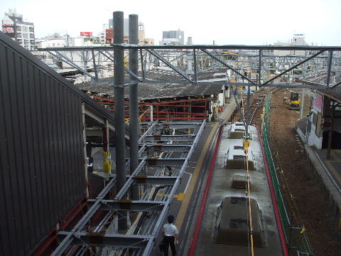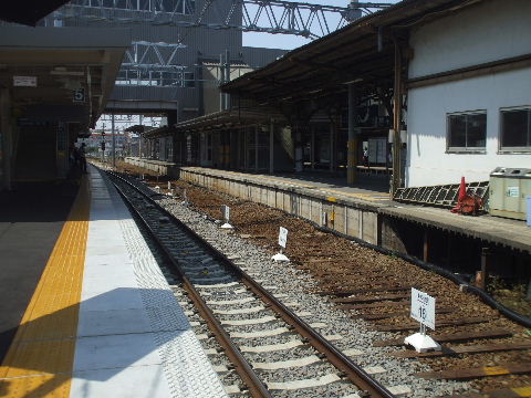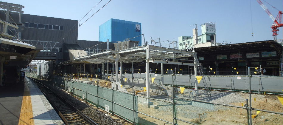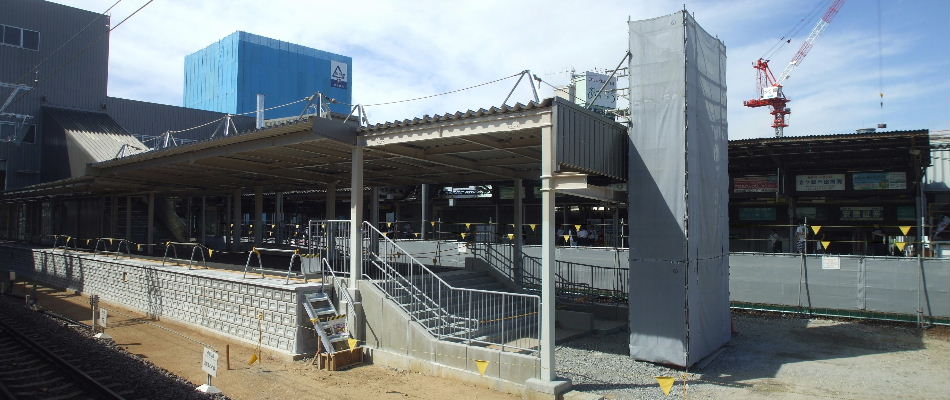 | 2010年5月1日。下り(名古屋方面)ホームの真ん中に3本、屋根を突き抜けてコンクリート柱が立てられている。仮駅建設に関係あり?。上下ホームのうどん店は2009年末に閉店している。 | 2010年7月10日。本線ホームの中程、屋根が撤去されている。エレベーター用の跨線橋が建設される。 |