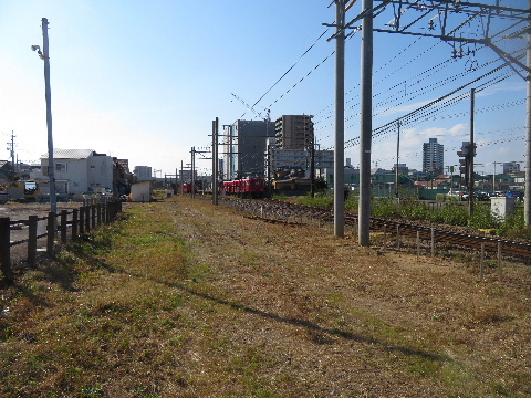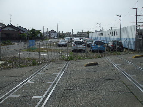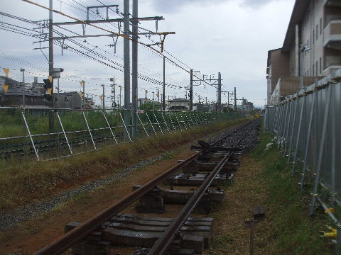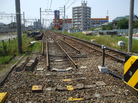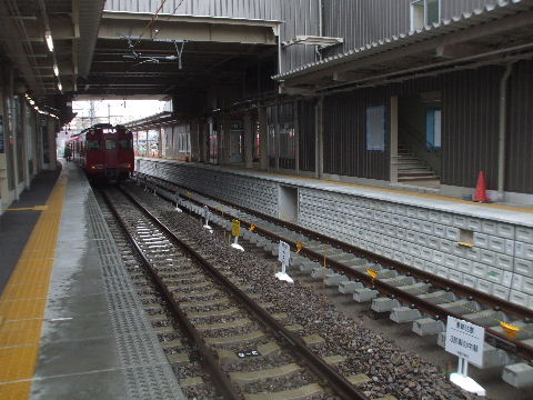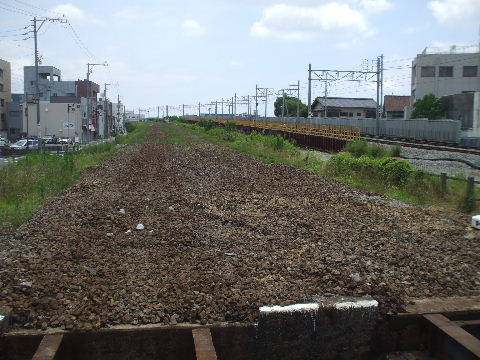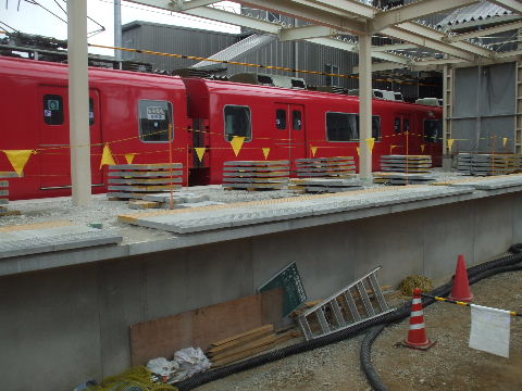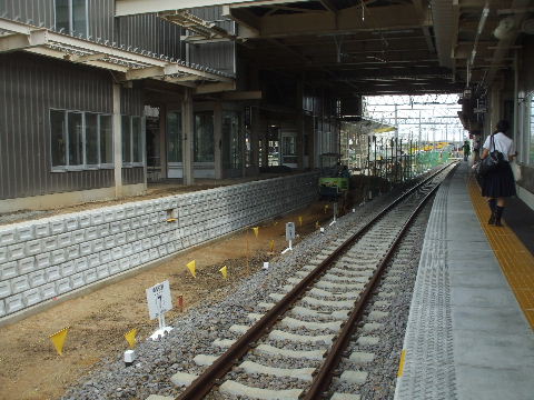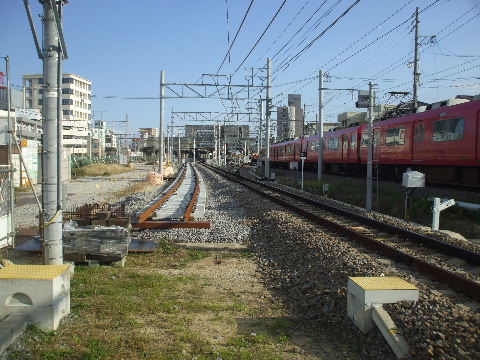 | 2007年9月1日。以前は三河線のホーム線と平行して敷かれていた留置線。 | 2010年11月13日。新しく少し間隔を空けて敷かれ直されている。これが仮ホーム位置になるか。 |