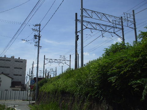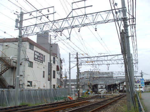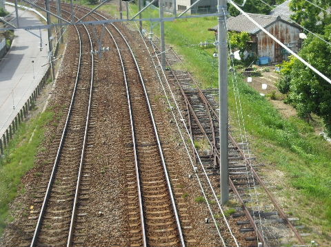 2017年06月22日。迂回している線路に合わせて架線柱も蛇行。 駅ホームから見る。 |