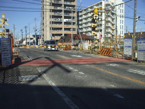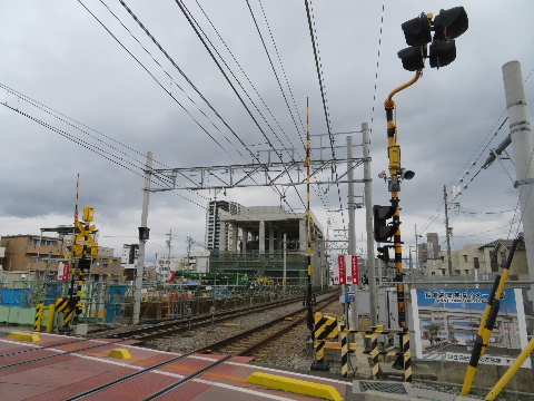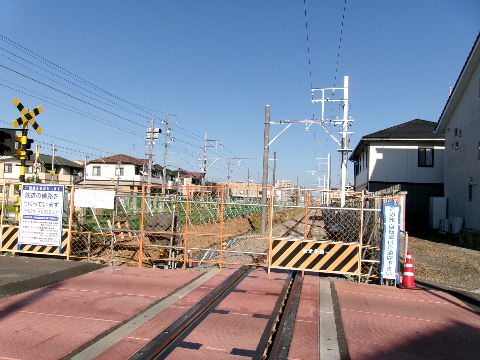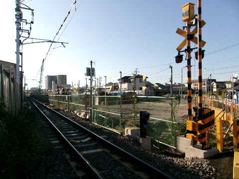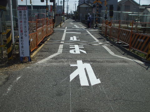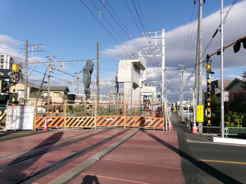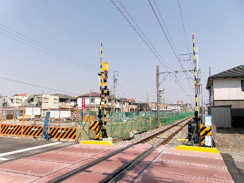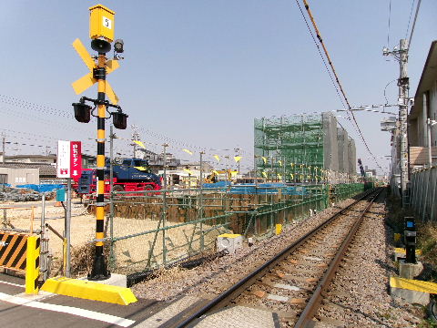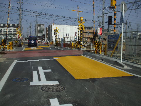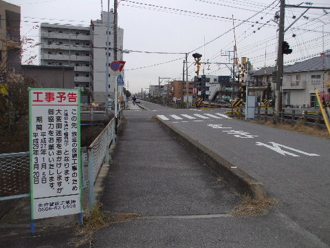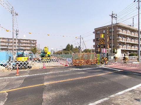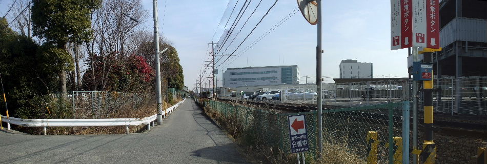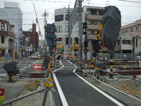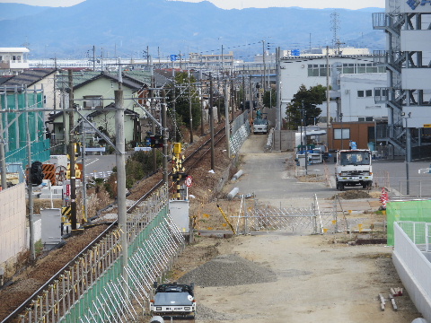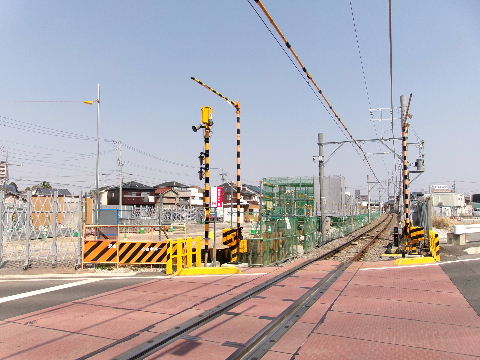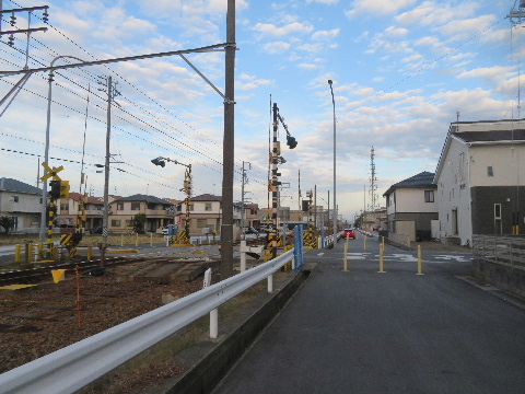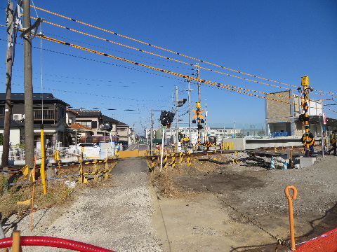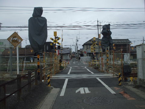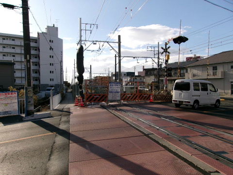 | 2018年02月11日。駅北の踏切を東から見る。今までの上り線踏切 用の警報機にカバーがかけられている。上下線で踏切が離れてい たが一つにまとまった。 |