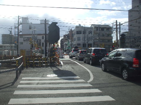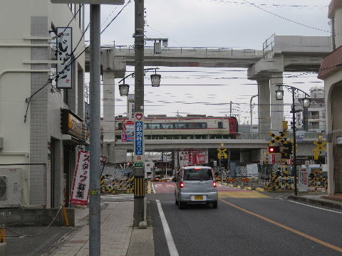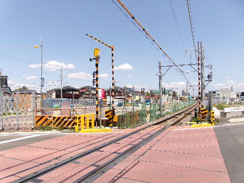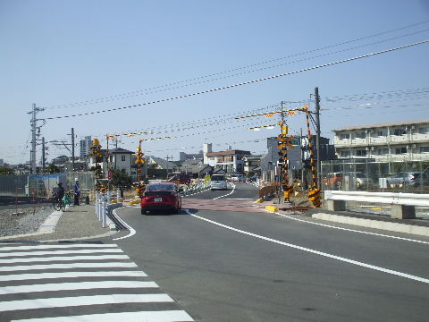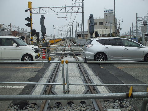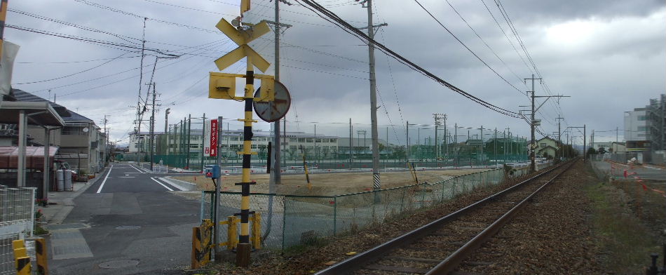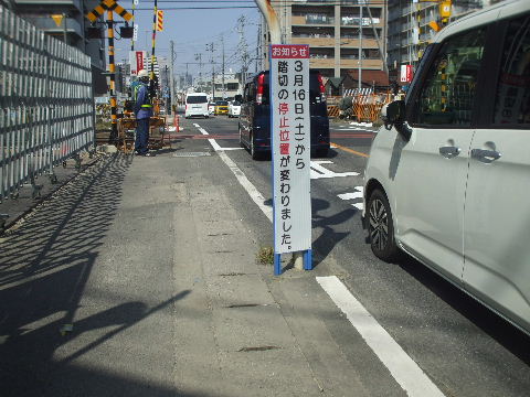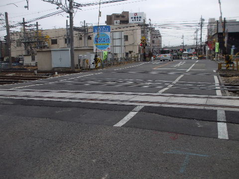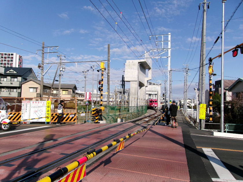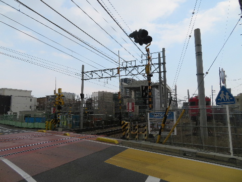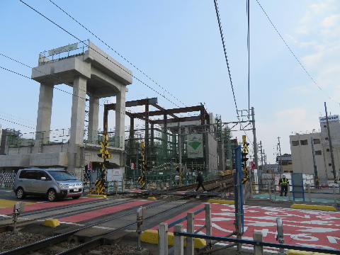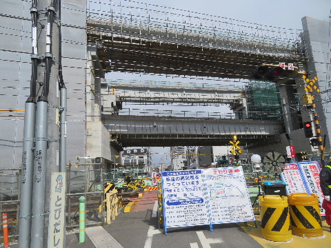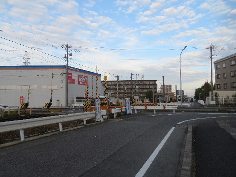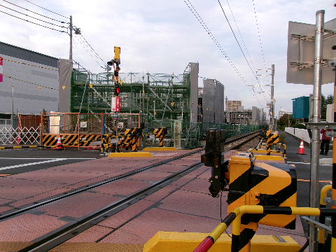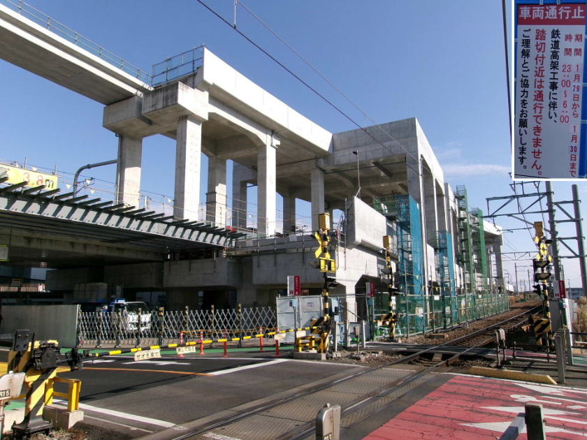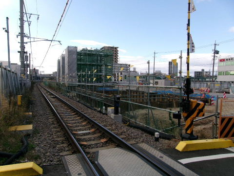 | 2018年02月11日。駅北の踏切を東から見る。今までの上り線踏切 用の警報機にカバーがかけられている。上下線で踏切が離れてい たが一つにまとまった。 |