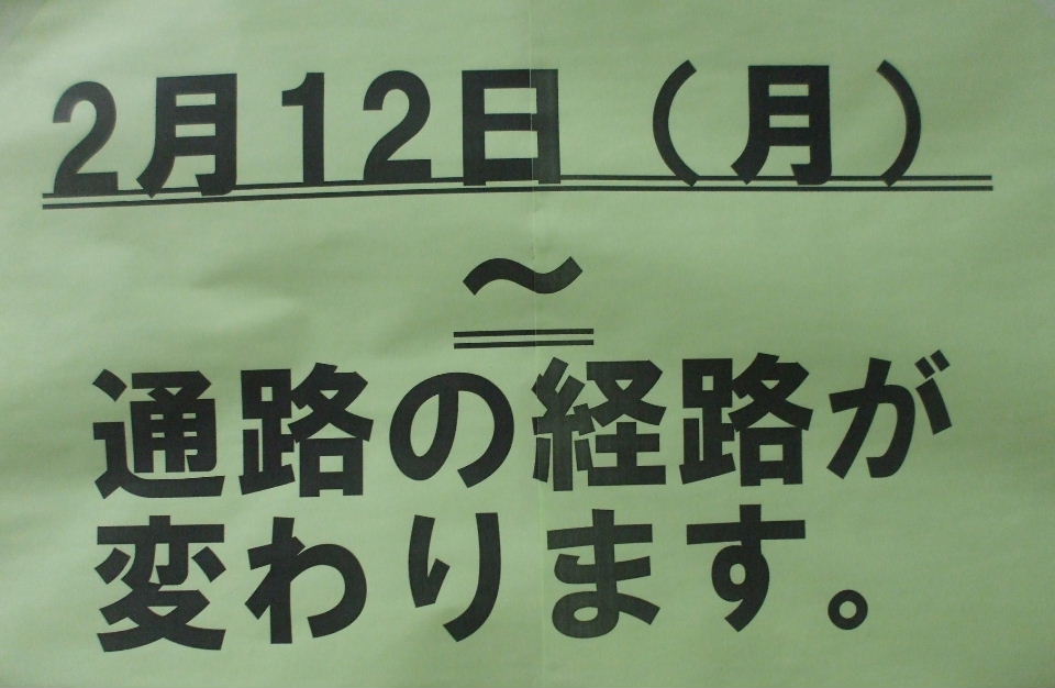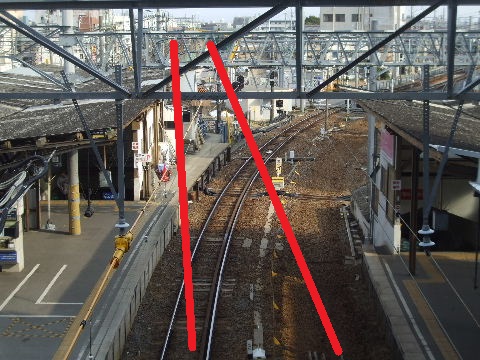 2018年02月11日。10日から上り仮ホームの使用が始まり線路が つなぎかわる。右に長い渡り線が平行する。 |