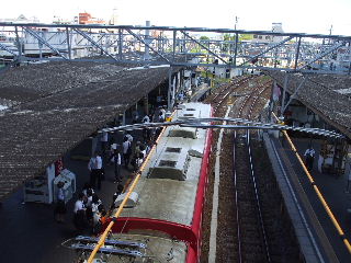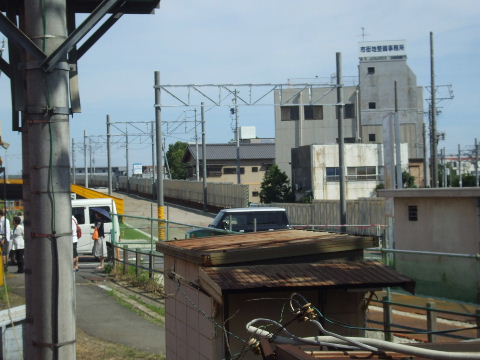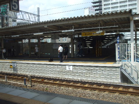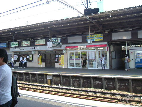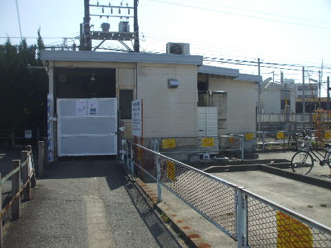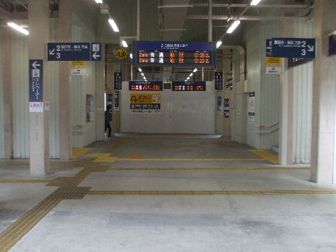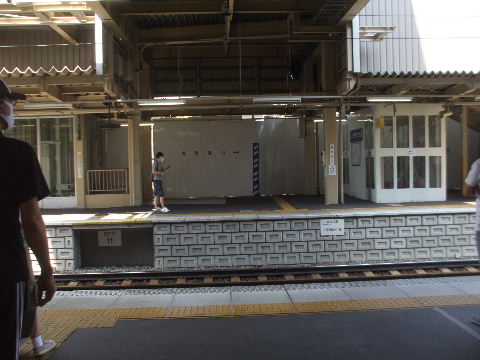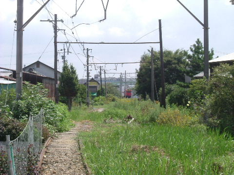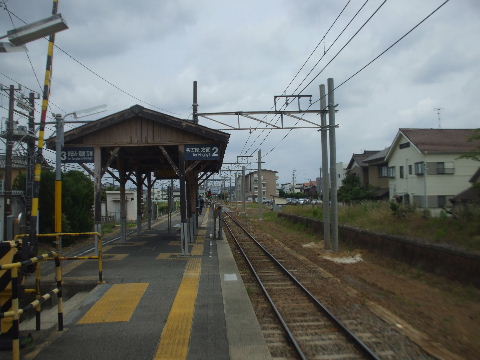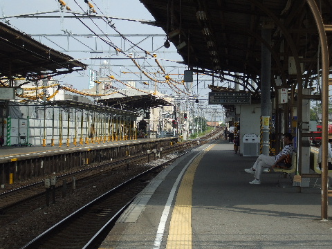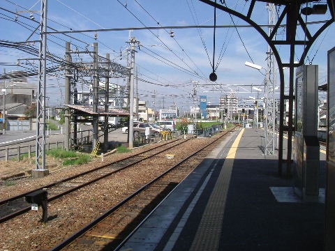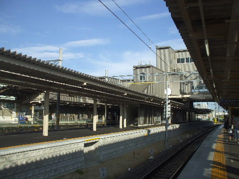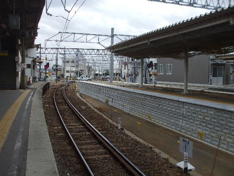 | 2010年7月10日。本線下りホームから見る。電線の黄色い保護カバーが目立つ。 | 2010年7月10日。屋根の無い向うに閉店したうどん店。 |