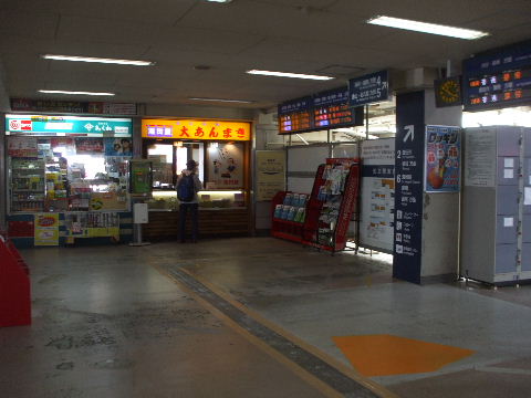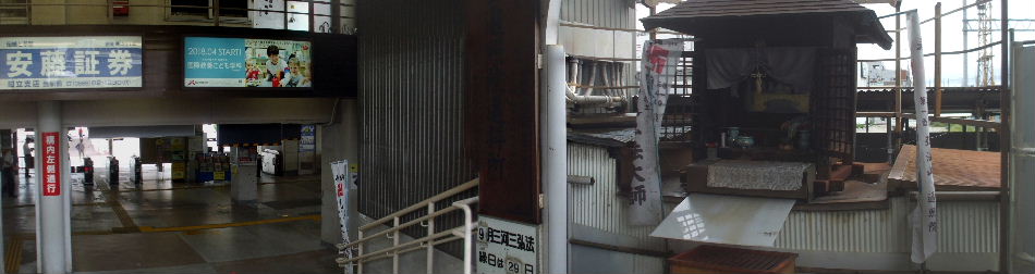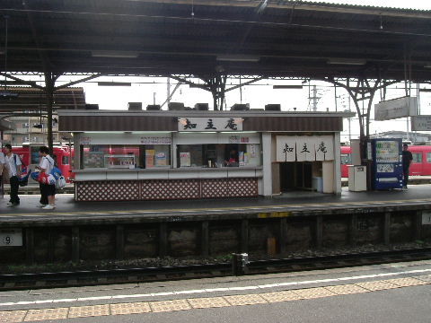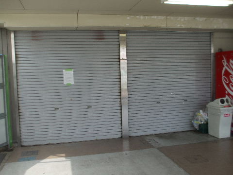 | 2007年08月04日。本線下り、三河線ホームにあった知立庵。跨線 橋作る為閉店。 | 2007年09月01日。本線上りホームの立ち食い店とサンコス。こちら も跨線橋作る為閉店。 |