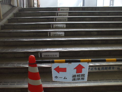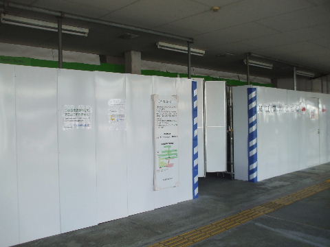 | 2010年7月10日。駅の西側に工事事務所。 | 2010年7月10日。ホームの工事案内板と工事事務所の入口の表示。 |