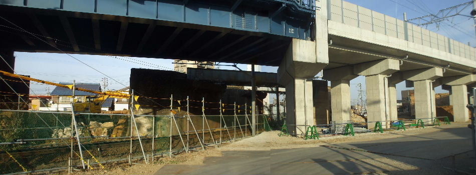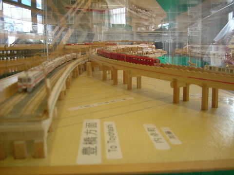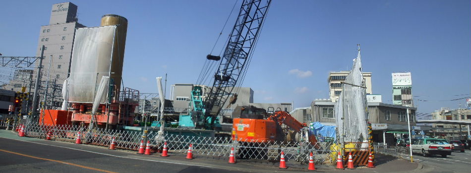 | 駅近くの図書館のロビーに置いてある高架完成予想模型。 | 今やっている工事。 |