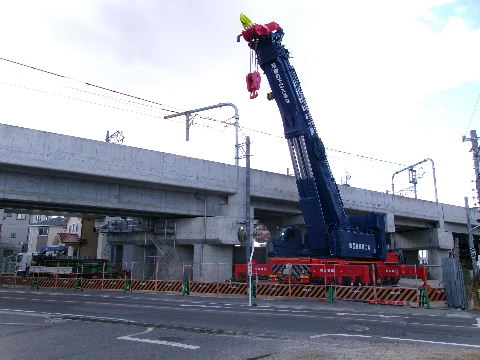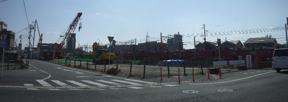 | 2018年02月11日。名古屋寄り、155号線南からこの高架が終わる 地点までの上り仮線はようやく路盤が出来たくらいの感じ。線路の 間にクレーンが立っているのが見える。 |