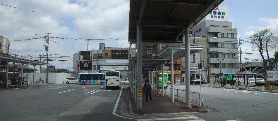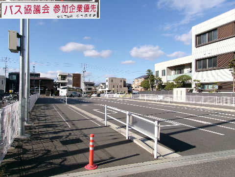 | 2024年12月15日。2つ上画像のビルの手前には 用地暫定使用でバス乗り場が設置され周辺の企業や 学校等の送迎バスが発着している。「専用」では ないので空いているときはほかの観光バスの乗降 とかでも使えるようだ。 |