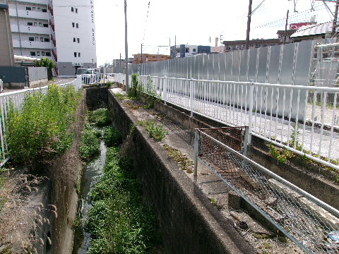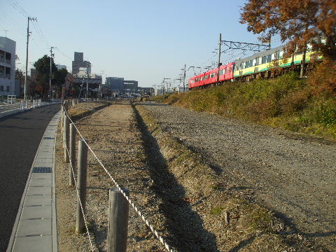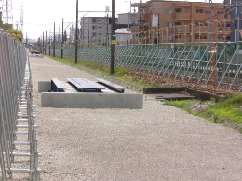 | 2010年9月11日 もう少し一ッ木駅寄りの仮線始まり地点。線路沿いから斜めに離れていくように道路が造り直されている様子がわかる。 | 2013年6月22日 水路の上の部分だけコンクリートでしっかり固められている。 |
