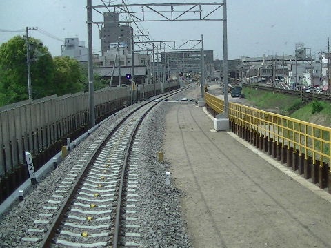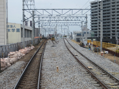 | 2016年04月23日。下り線仮線に切り替わる。 | 2016年04月23日。分岐器は撤去されている。この後は旧下り線が 撤去されその跡に上り線仮線が敷設される。 |
