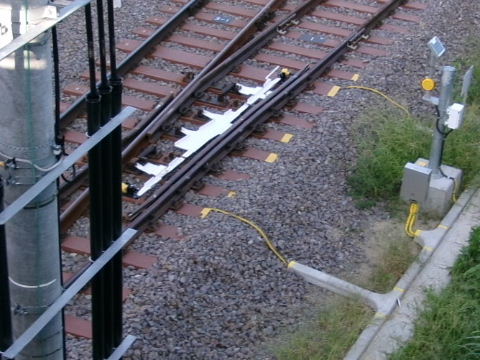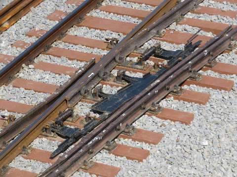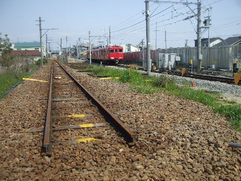 | 2024年03月16日。東にある踏切から見る。 | 2024年03月16日。知立方にある留置線の乗越 分岐器。ばね仕掛けになっていてこれでレールを 跨ぐのか。 |
