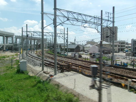 | 2019年08月03日。上り仮線工事に先だって行われている高架橋 の工事が進んで来たのに合わせてその前後の仮線の工事も始ま っている。名古屋寄り高架が始まる箇所では下り仮線に並べて上 り仮線の道床作りが始まっている。下り車内から見る。 |