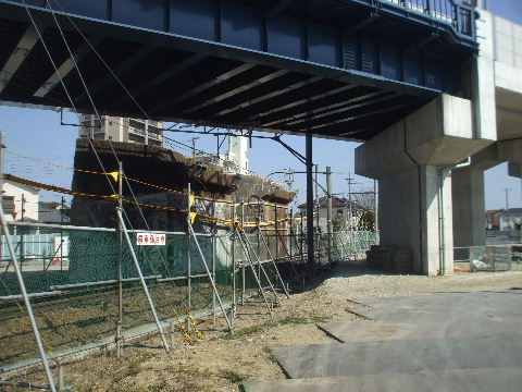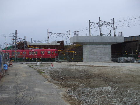 | 2010年11月13日。跨線橋の鉄骨が本線上を跨ぐ。 | 2010年11月13日。三河線側はこれから。 |