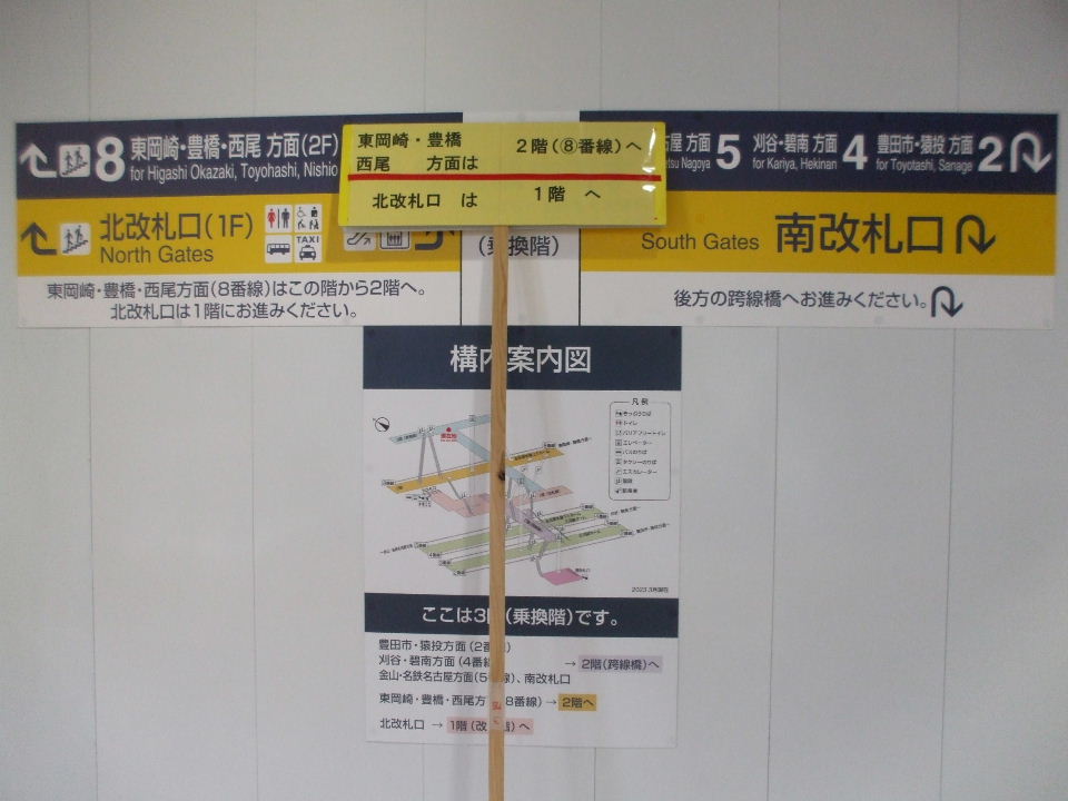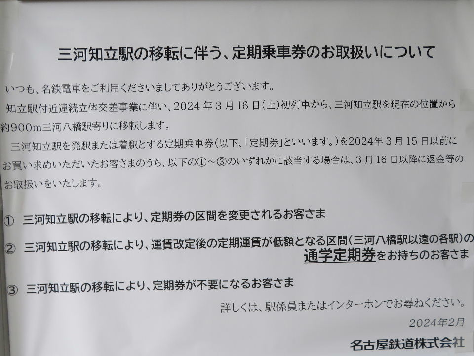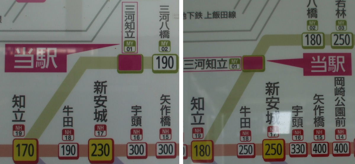 | 2024年03月16日。知立方面ホームには飲料自販機。 | 2024年03月16日。駅が三河八橋方向に移動した ので隣の駅までの金額が同じになった。 |