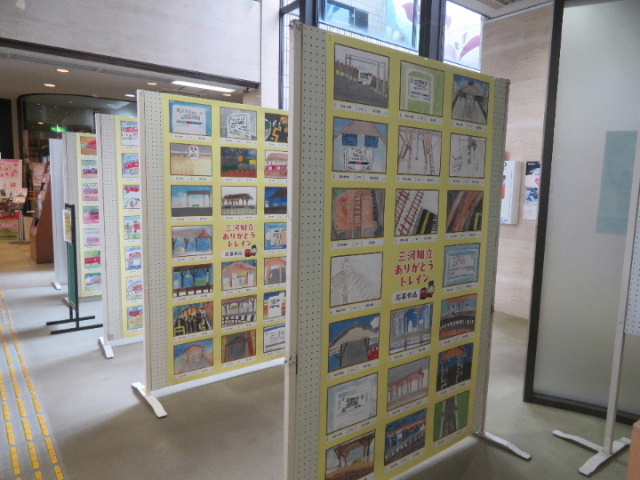 2024年02月18日。知立図書館ロビーに子供の描いた 三河知立駅の絵。 |