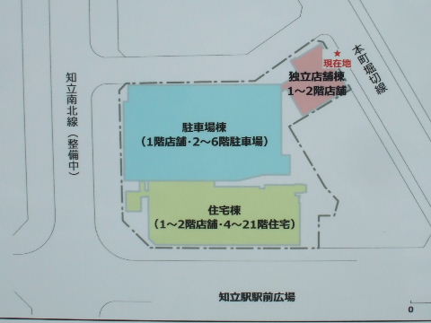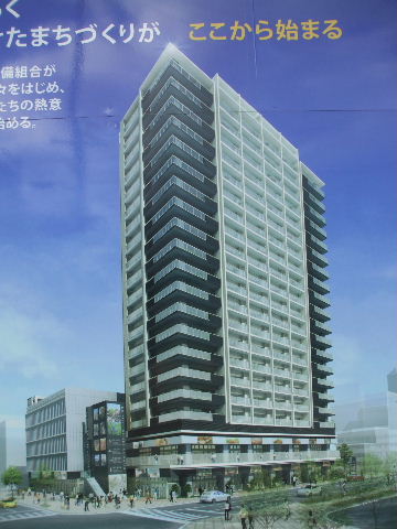 | 2016年12月23日。駅前から見る。再開発ビルの工事が始まっている。 | 2016年12月23日。現場掲出の予想図。21階建て 住宅ビル。1、2階は店舗。2018年完成予定。 |