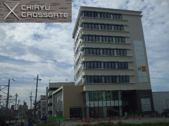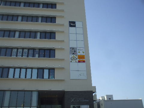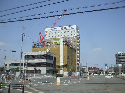 | 2019年03月31日。テナントがぼちぼち入り始めている。 | 2019年03月31日。ビジネスホテルの建物が出来てきた。手前にあ る、駅前にあった旅館の移転先ビルの屋上にぽつんと何かがのっ ているのが見える。 |