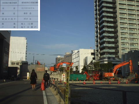 | 2024年04月14日。駅前の道路拡幅工事中。 | 2024年05月26日。ホテルの外壁の色が変わる 辺りまでの高さになる。 |