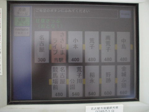 2017年10月05日。券売機の「往復きっぷ」のボタンを押すと「名古 屋300円」の表示。通常は200×2で400円。 |