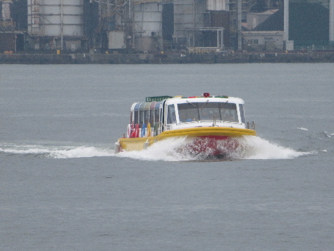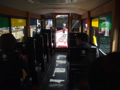 2017年10月08日。船内は両側一列シート。船が小さいのでほぼ無 風の湾奥でも結構揺れている。 |