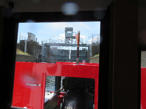 | 2017年10月08日。船から閉じた門を見る。 | 2017年10月08日。海抜〇メートル地帯を流れている運河なので水 位が海より低い。海の水位から運河の水位へ下降中。 |