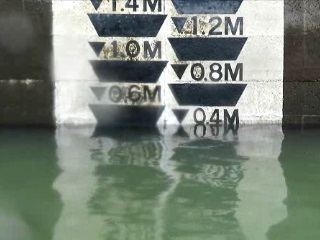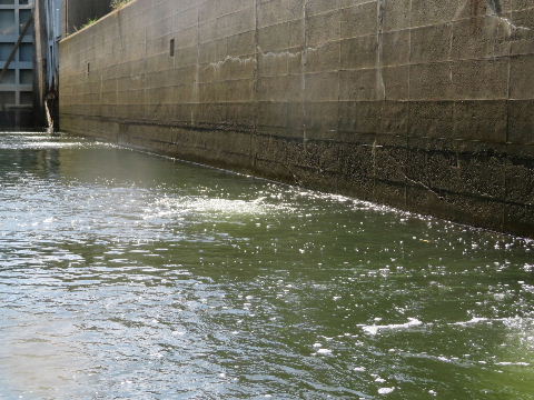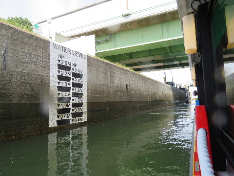 | 2017年10月08日。水位計を見ていると段々下がって行くのが判る。 | 2017年10月08日。運河側の水門が開いて出発。水位が目盛の無 い所まで下がっているのが判る。壁の濡れているのでどれだけ下が ったか判る。今日はまだ少ない方のようだ。上は国道23号線。 |