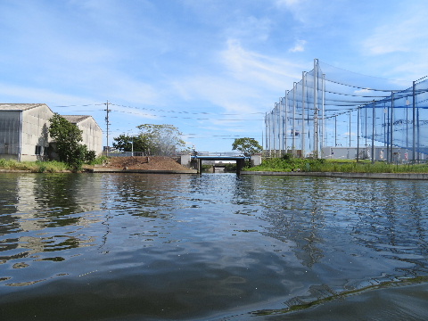 2017年10月08日。港北運河東側入口。少し奥の臨港線の鉄橋を 潜った所に新しい船着き場が出来ているがまだ商業施設が出来て いないので今のところは通過。右は既にオープンしているゴルフ練 習場。 |