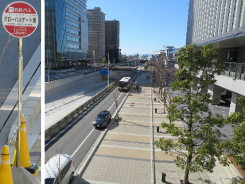 2017年10月14日。イベントも終わってグローバルゲートから出てく る客だけになりこんな感じ。オープン前よりは増えた。名古屋駅か ら来る便は少ない。名古屋駅も駅に近い側にある降車場を乗り場 兼用にした方が良さそう。 |