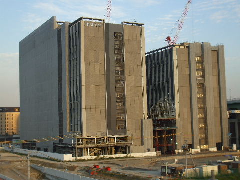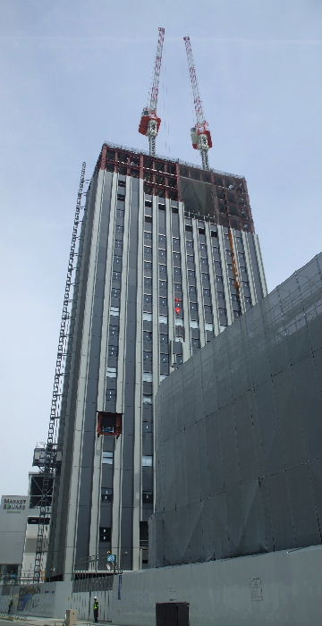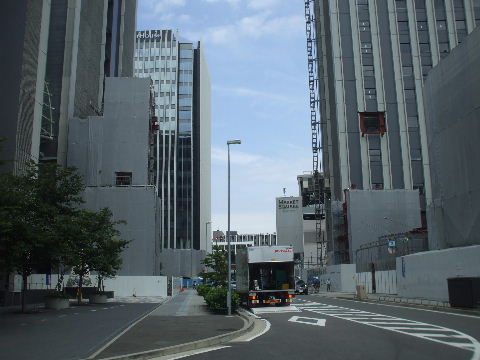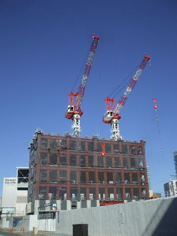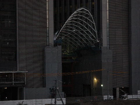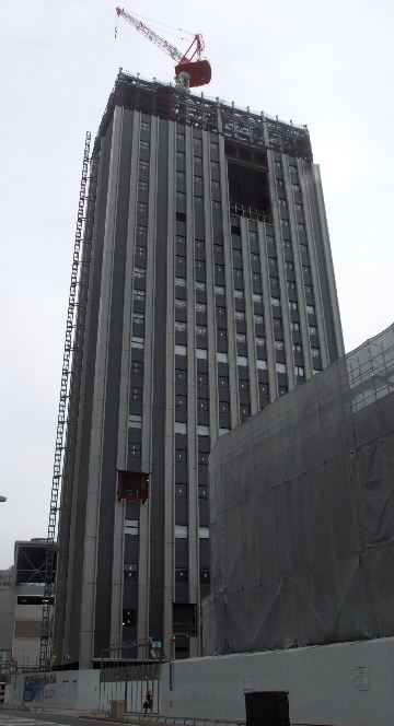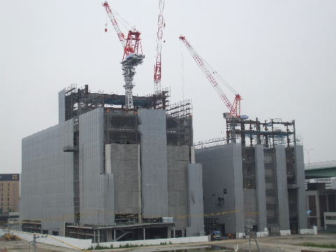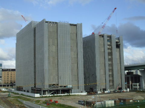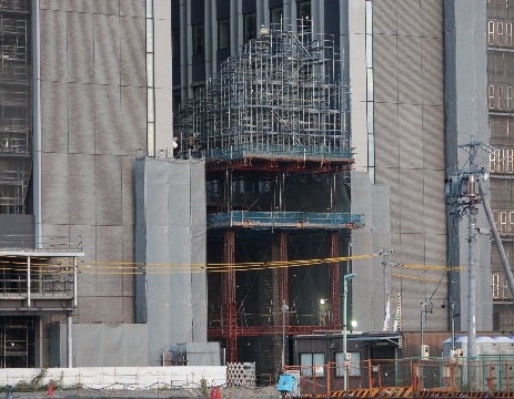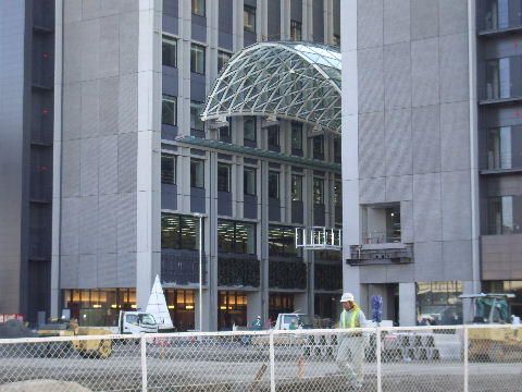 2011年10月29日。ビル間右の棟の外壁が見えるようになり間の屋根工事が始まっている。