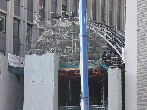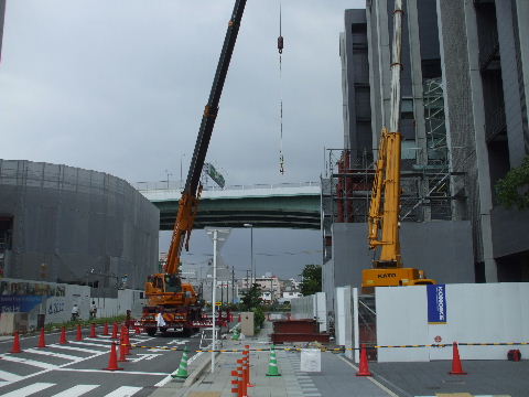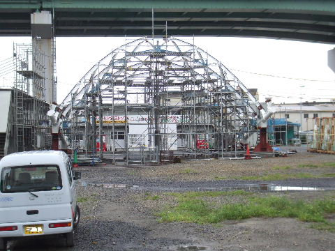 | 2011年9月4日。2期工事予定地の工事事務所前でこんな鉄骨を組み立てている。二棟のビルの間の屋根にな