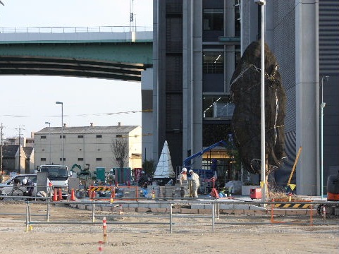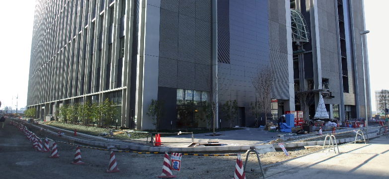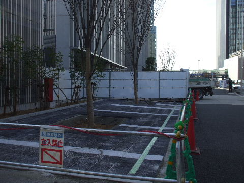 | 2012年2月19日。ビル東隣、工事事務所のあった二期工事予定地も縁石を並べて整備中。