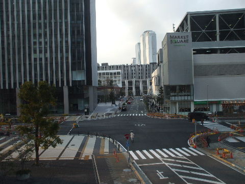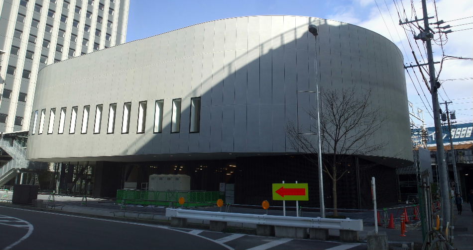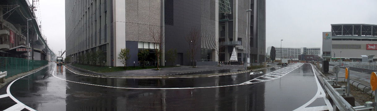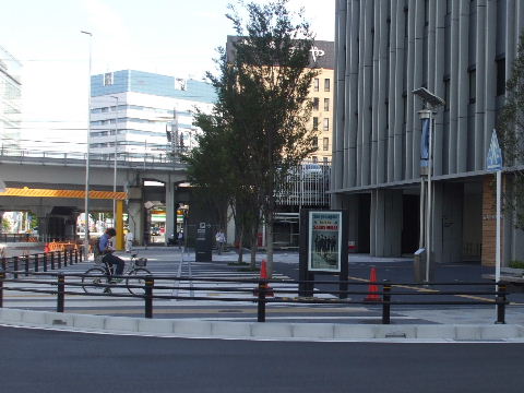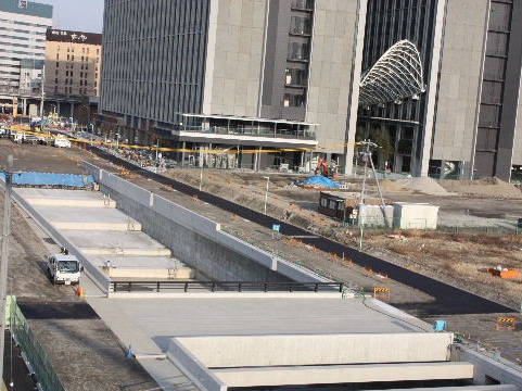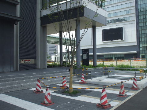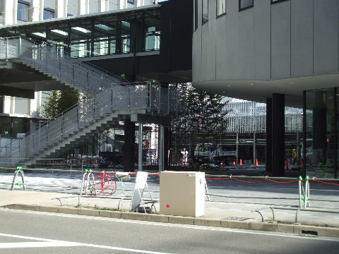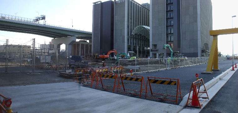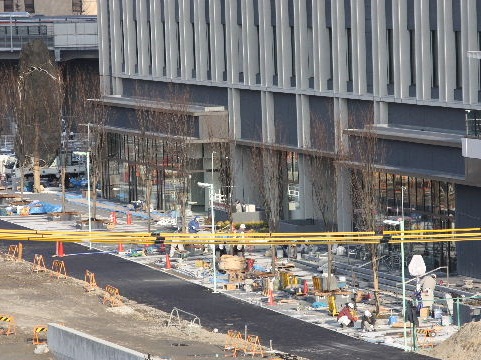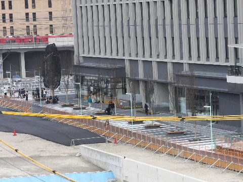 | 2012年2月19日。南(高速)側、東(新幹線)側ではビル周りに植樹され歩道の縁石の工事も進む。飲料自販機も