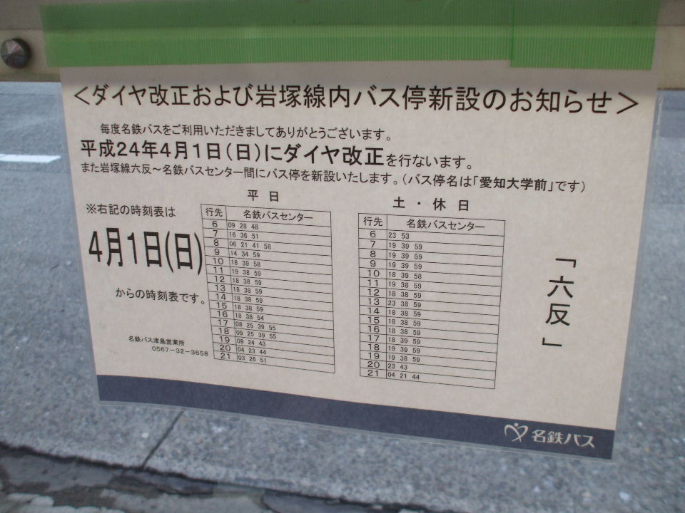 | 2012年3月24日。名鉄バスの新しいバス停。六反交差点北にある六反バス停からは300メートルほどしかない。 |