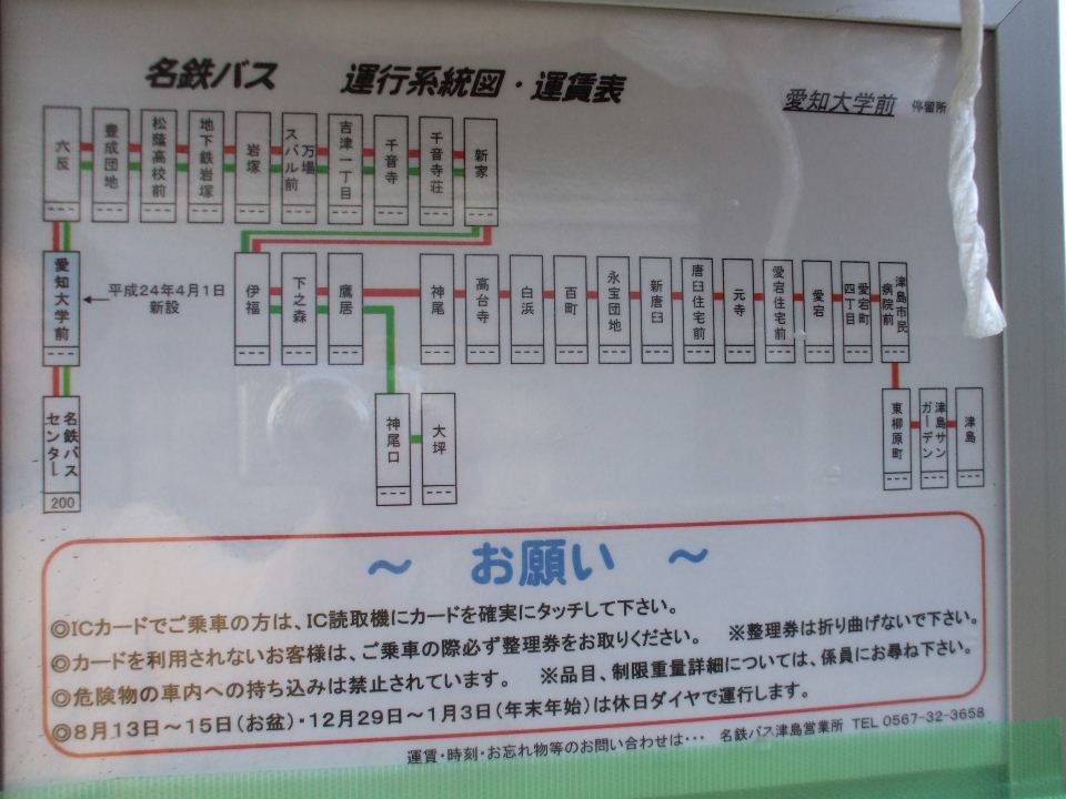 | 2012年3月24日。津島や途中の七宝町からの今までも走っていた路線に新しいバス停名が入った路線図。 |