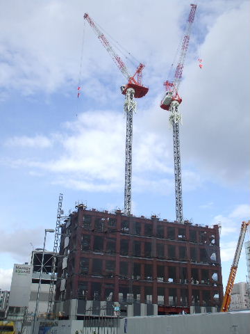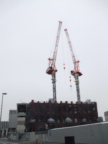 | 2011年4月3日。鉄骨が左の建物は6階へ。右の建物は4階へ。