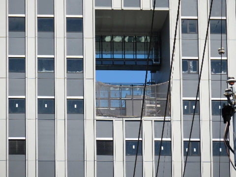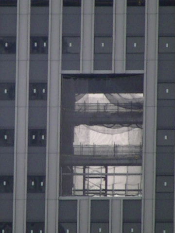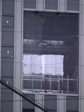 2011年9月17日。ビル間の壁面に屋根を取り付けるための鉄骨がシートから飛び出ている。
