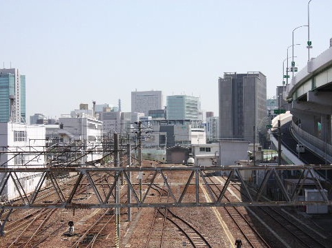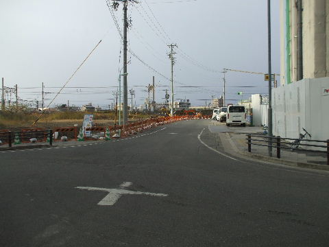 | 2012年4月21日。愛大前、笹島線上から西を見る。笹島線が掘 割へ下り、椿町線に突き当る向こう側に 壁のように立つことにな りそうだ。 |