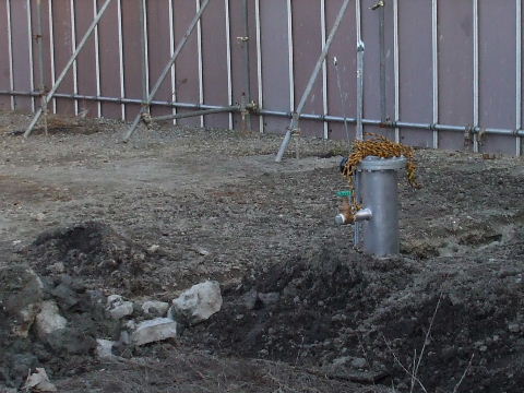 | 2012年11月3日。作業用の入口部を塀で囲い、中に櫓が立った。 | 2012年11月3日。表示がないので正確な事は判らないがシロウト 目には老人ホーム用か何かの温泉でも 掘っているのかとも思える。 |