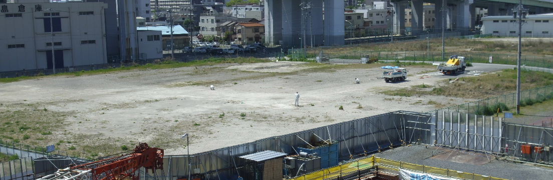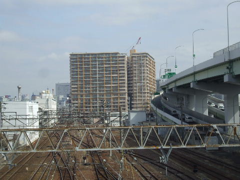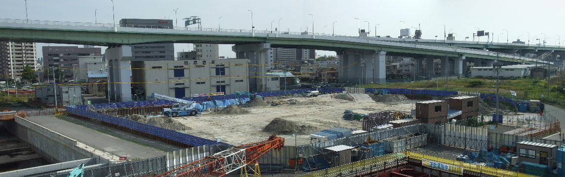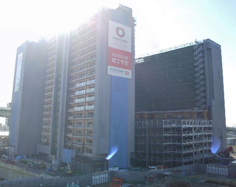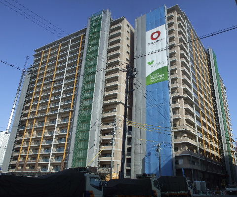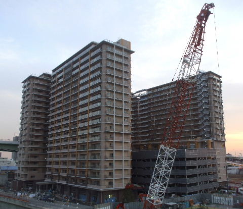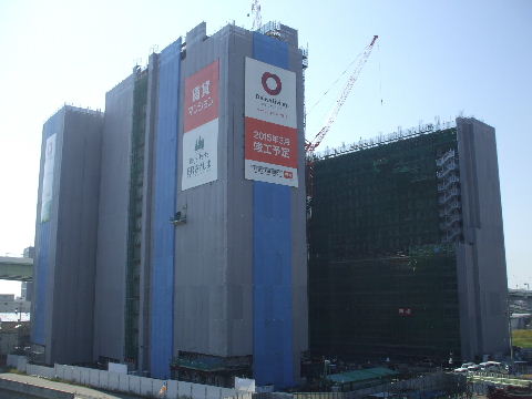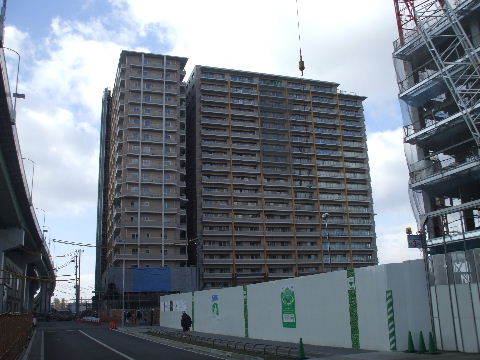 | 2012年4月21日。椿町線掘割の西側に建設される。19階建て三 棟。駅から予定地を見る。 |