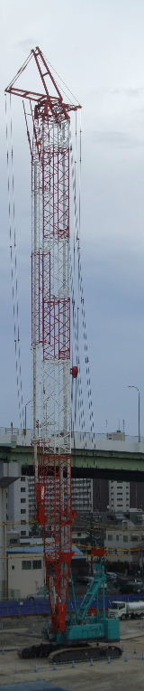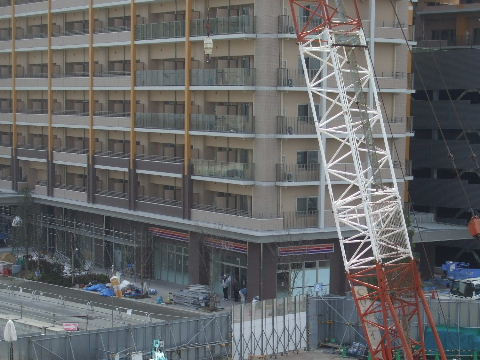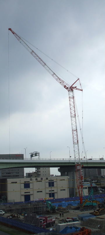 2013年9月7日。作業中で腕が伸びている。かなり高く、 用地の真ん中辺にいてぐるりと回りこれ で19階まで資 材とか全部揚げるに違いない。 |