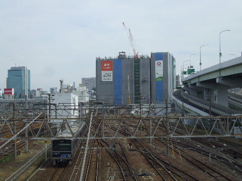2015年02月21日。向野橋から見るとあおなみ線の線路がRPと左のJR のビルのすき間を抜けてくるように見える。 |