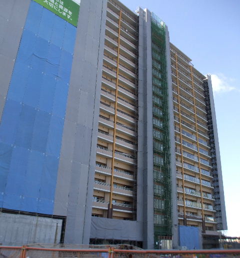 | 2014年10月19日。多分あと1階。奥の西棟には非常階段。 | 2014年11月23日。クレーン片付く。 |