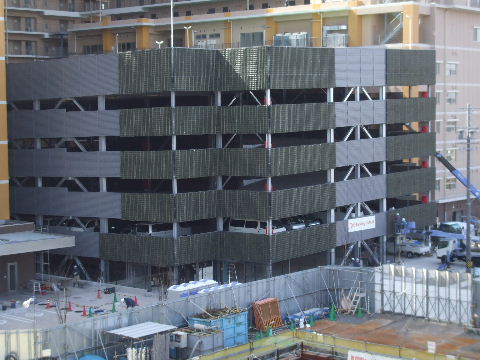 | 2014年11月23日。内側の下の方、外観見えてくる。 | 2014年12月6日。コの字型に建った中で駐車場棟と思われる鉄骨組
